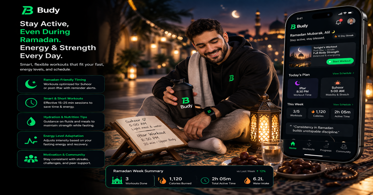 Budy uses meal timing preferences, intensity management, and cultural food intelligence to create Ramadan-appropriate programs.