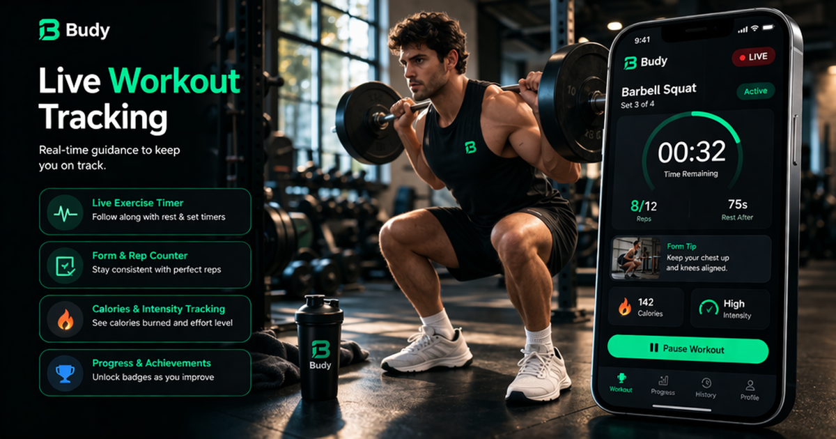 Budy generates voice narration for your workout sessions — exercise names, set counts, rest timers, coaching cues, and transitions. Download the audio before your session and train hands-free with a voice coach that knows your exact plan.