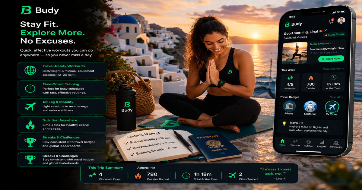 Before you travel, Budy lets you download exercise videos and voice-guided audio narration for your upcoming workouts. This means you can train in a hotel room with no internet and still have full exercise demos and coaching cues.